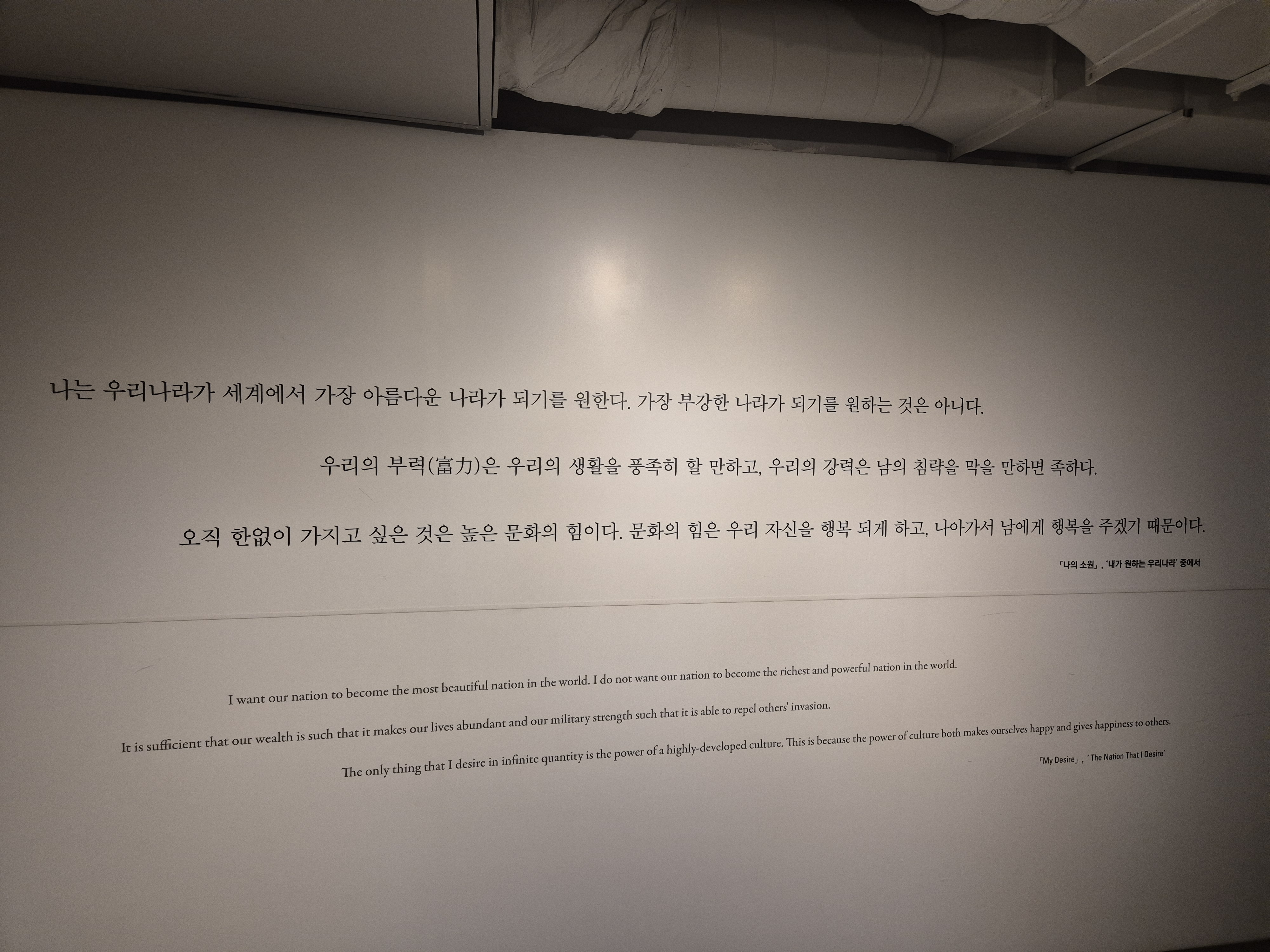 나는 우리나라가 세계에서 가장 아름다운 나라가 되기를 원한다. 가장 부강한 나라가 되기를 원하는 것은 아니다. 우리의 부력은 우리의 생활을 풍족히 할 만하고, 우리의 강력은 남의 침략을 막을 만하면 족하다. 오직 한없이 가지고 싶은 것은 높은 문화의 힘이다. 문화의 힘은 우리 자신을 행복 되게 하고, 나아가서 남에게 행복을 주겠게 떄문이다. - 나의 소원, 내가 원하는 우리나라 중에서 -
